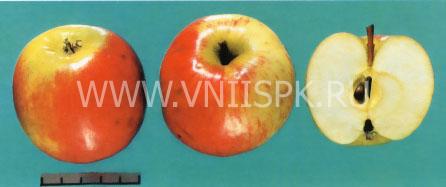 Плоды (рис.) крупные, удлиненно-округлые, правильной формы. Поверхность гладкая. Основная окраска зеленовато-желтая, покровная – размытая с красными полосами и крапинами на большей части плода. Кожица нежная, гладкая, сухая, блестящая. Плодоножка короткая, средней толщины, несколько изогнутая. Чашечка средней величины, закрытая. Глубина и ширина воронки средние. Оржавленность отсутствует или очень слабая. Семенные камеры закрытые, средние. Семена средние, эллиптические, темно-коричневые.