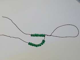 Складываем бисеринки петелькой и скручиваем проволоку. Набираем на длинный конец проволоки 11 бисеринок.
