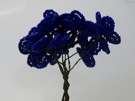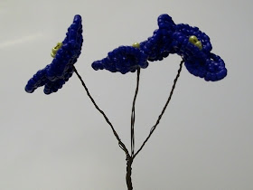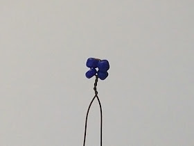 Фиалка выполняется в петельной технике. Цветочков будет 9 штук, но можно и больше сделать. Каждый отдельный цветок плетется сразу цельный, поэтому проволоку отрезаем сразу приблизительно 60-70 см, чтобы точно хватило и не пришлось, потом приматывать куски. Нанизываем на проволоку 6 синих бисерин и закручиваем их в петельку.
