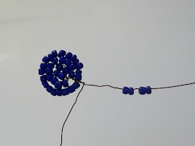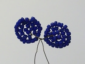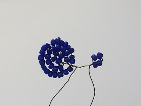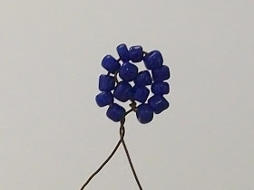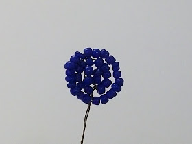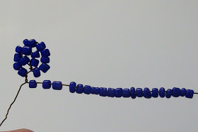 Отмеряем 6-7 голубых бисерин и закрепляем плотно проволоку между 5 и 6 синими бисеринами на самом лепестке.