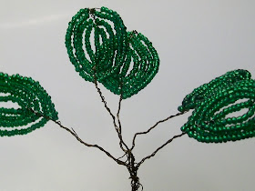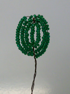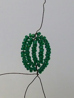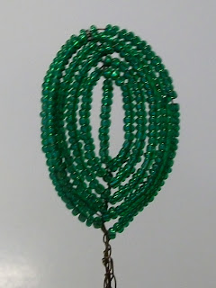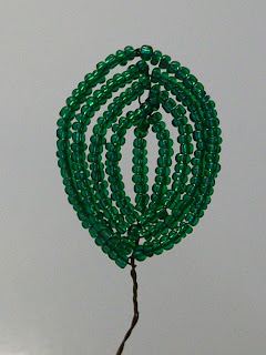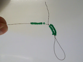 Так как листок будет резной, то дальше будем делать следующим образом. Нанизываем снова на длинный конец проволоки бисер и продеваем ее под петлю, после чего плотно пропускаем эту проволоку между бисеринами.