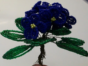 Далее берём цветок махровой фиалки из бисера и вставляем в серединку цветка готовую тычинку. Проволоку тычинки скручиваем с проволокой цветка.