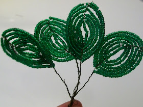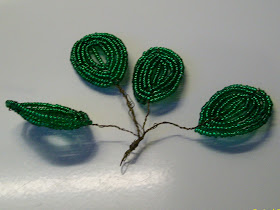 Один средний листик плетем на проволоке около восьмидесяти сантиметров в длину. Основание состоит из двенадцати штук зеленого бисера. Производим пять оборотов около оси и получаем один лист среднего размера. Всего нужно сплети семь таких деталей.