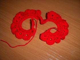 - Третий ряд. Вязать нитью розового цвета. Начать 3 возд. петлями подъема. В первую арку из 2 возд. петель провязать 3 ст. с накидом, в последующие 4 арки из 2 возд. петель провязать по 6 ст. с накидом, в следующие 4 арки провязать по 8 ст. с накидом, в оставшиеся 6 арок провязать по 10 ст. с накидом. Нить закрепить и обрезать.