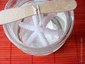 - Теперь в этот раствор опускаем нашу снежинку и ставим банку в тихое место.